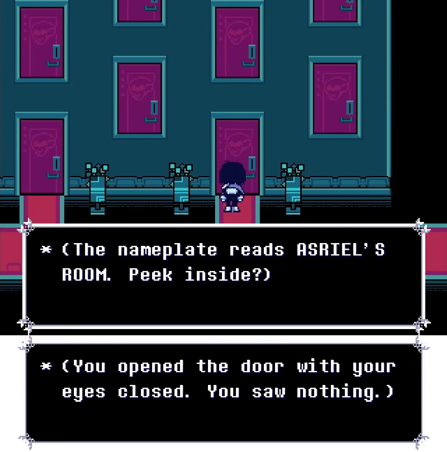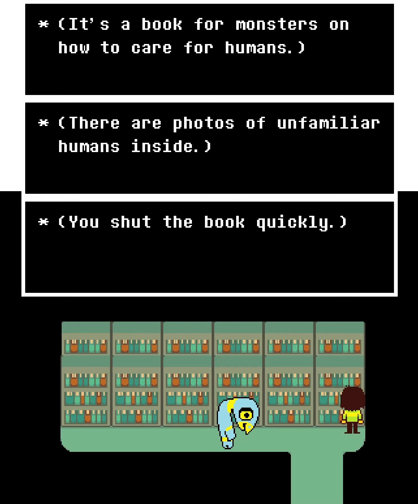 This level of control in itself is still a significant amount of power to have over an individual though what makes the power that the player has over Kris’ actions arguably weaker than the power that they wield in Dark Worlds lies in the moments where Kris demonstrates more resistance to the soul’s will. Throughout the game, their subversion of the player’s control usually comes in the form of comedic bait-and-switch interactions where Kris performs the action that the soul chooses for them but does so in a way so that the player could not benefit from it in any way. Kris often does this presumably for reasons related to keeping their personal life private, such as when they close their eyes when the player has them open up Asriel’s room in Queen’s mansion so we couldn’t know what’s inside (pictured left) or when they quickly shut a library book for monsters on how to care for human children upon opening it up (pictured right).