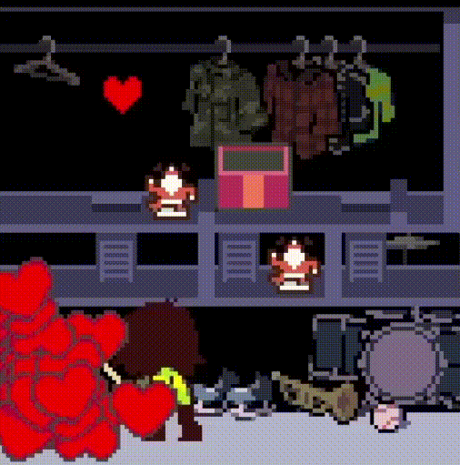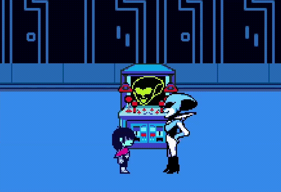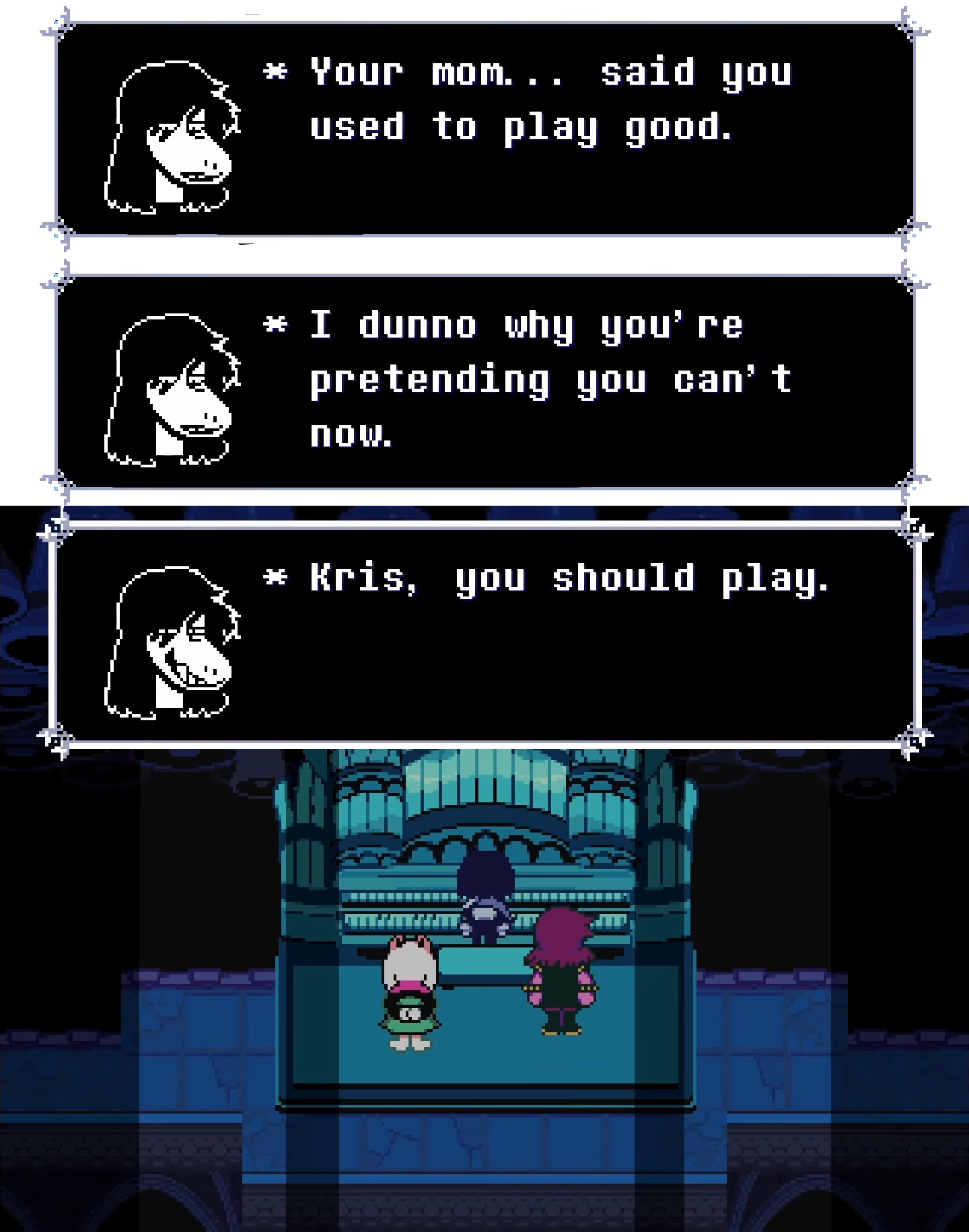 At the Dark Sanctuary's organ piano, Susie encourages Kris to play the complicated piece necessary for unlocking the door to the fountain, which the red soul struggles to do by itself. Susie's supportive words are enough for Kris to gather the courage to effortlessly and passionately play the piece themself without the assistance of the soul.