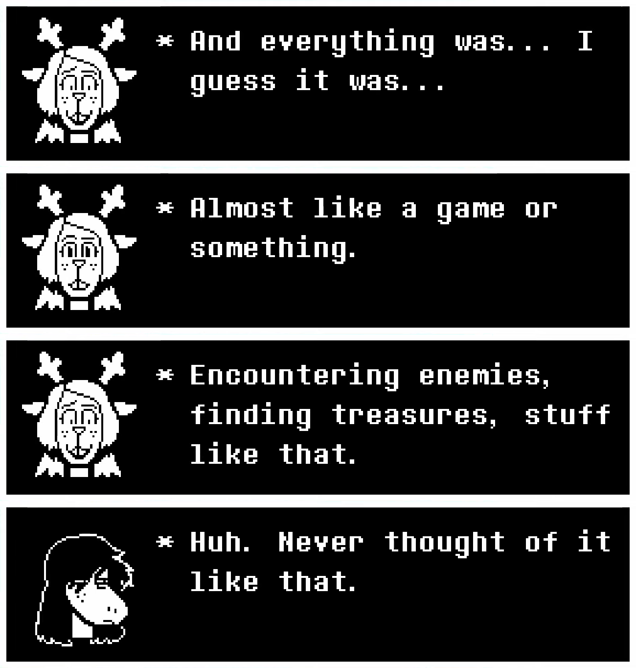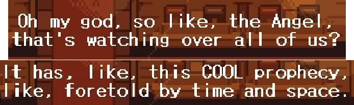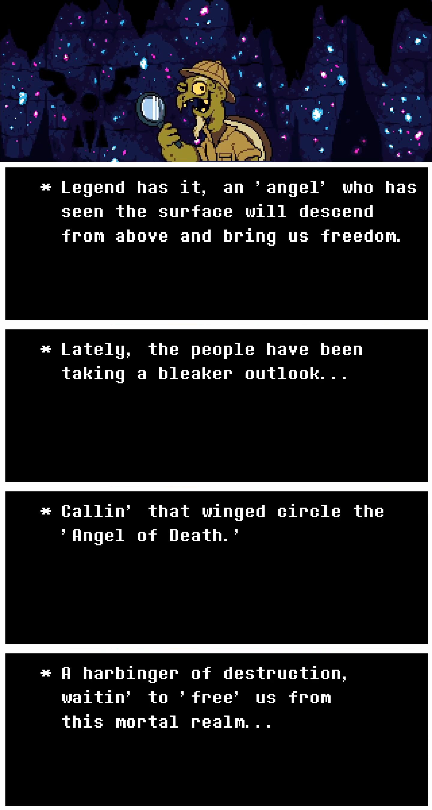 Left: in Undertale, Gerson Boom tells of a prophecy that refers to an 'angel' that will bring about either liberation or destruction to all monsters similar to how the player is given the choice to fight or spare in each encounter. Up Right: in Deltarune, Catty gives a 'reading' in church that implies that the angel is an omnipresent figure at the center of the prophecy who is responsible for enacting it in some way. Down Right: the soul, hidden behind an ornament depicting the ultimate decider of the fate of the world, is kicked by Susie when attempting to get her attention. 'Angel of Death,' indeed.