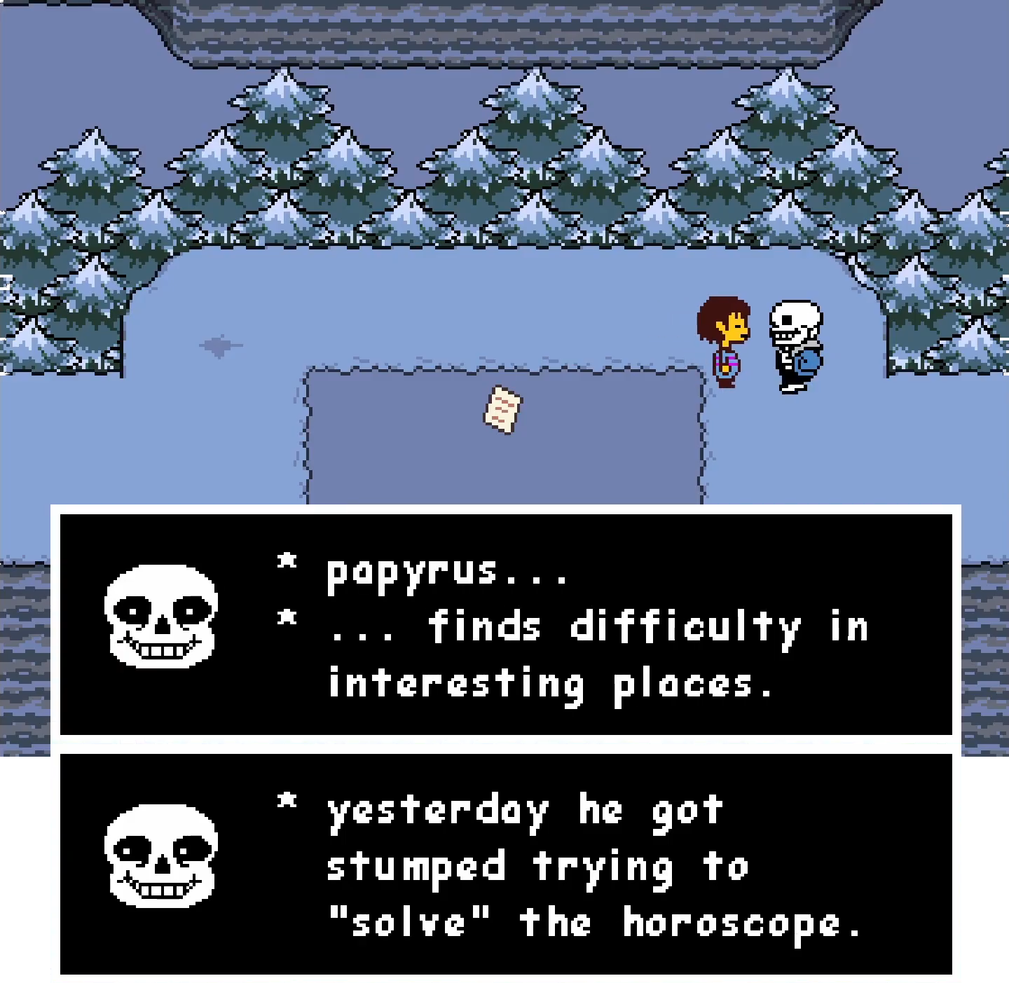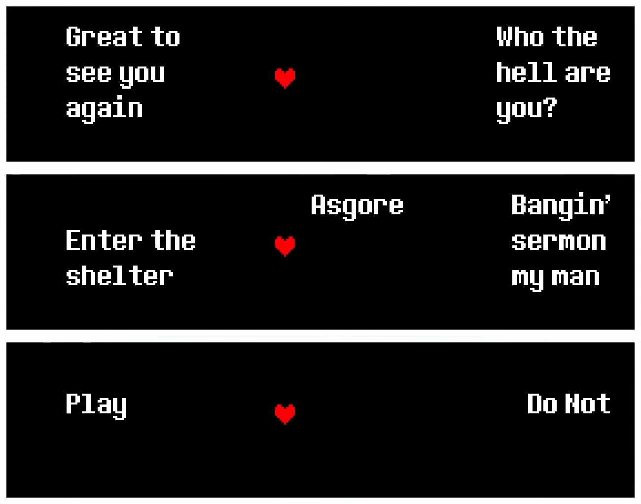 Top: when meeting Sans for the first time in Chapter 1, the player is given the option to have Kris greet him like an old friend or impatiently ask him who he is. Most first-time players are more likely to pick the first option due to their familiarity with Sans from Undertale despite Kris never having met him beforehand. Middle: the player is given three different dialogue options when interacting with Father Alvin after the church service in Chapter 4, inquiring about Asgore and the underground shelter at the end of town and complimenting his 'bangin' sermon.' Bottom: when interacting with the small piano in the hospital or the large grand piano in Noelle's house, the player is given the option to have Kris play it or not. Choosing for them to play causes them to quickly press the keys with an unceremonious 'plink,' which is what the game's soundtrack calls a 'Concert for you.'