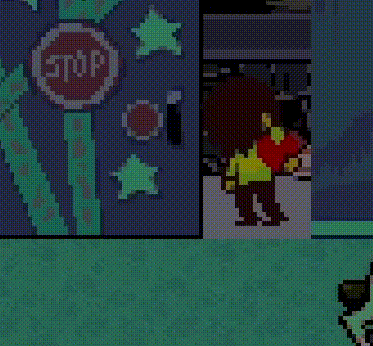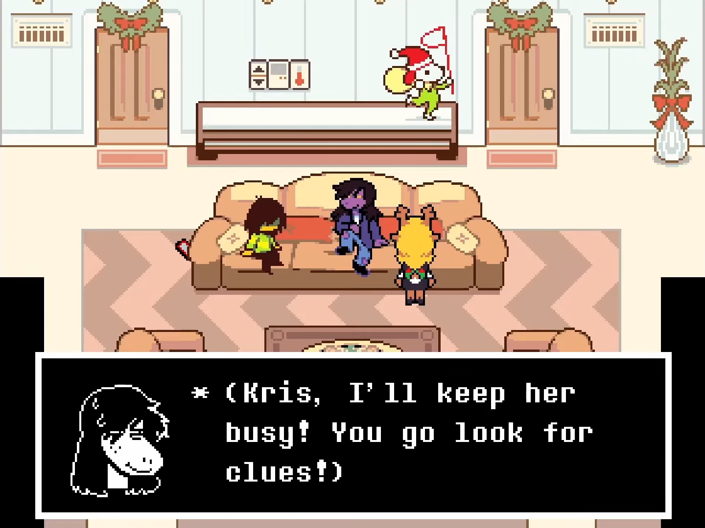 As the comedic conflict between Kris’ desperation and the soul’s fragility plays out in the closet, Noelle patiently recounts the events of her ‘dream,’ or her experiences in Chapter 2’s Cyber World that she’s only convinced were a dream, to Susie, discussing details that Susie hadn’t considered like Ralsei’s resemblance to Asriel (pictured left) and the game-like encounters present throughout the Dark World (pictured right).