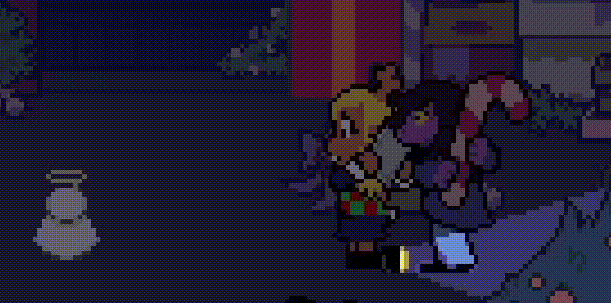 As the player struggles in place, Noelle and Susie playfully joke about the possibility of a mouse or a severed hand being inside the angel ornament and consider keeping it as a pet while “The distance between two” begins ringing out in the background again as if to remind the player of their original mission to find the shelter code with Kris. In fact, the combination of the soundtrack and the banter of Susie and Noelle almost comes across as mocking the player and pointing toward their weakness in this current moment, being reduced to just an unwanted anomaly and a household pest rather than a destiny-defining deity. In that respect, this entire sequence becomes extremely funny when looking back on it in a way that is more subtle than what Toby Fox’s approach to humor usually allows. While Undertale and Deltarune’s humor regularly derives from absurdism as expressed through either verbal character quirks and non sequiturs or cartoonish visual gags, the inherent absurdity of the player’s power being subverted by the limited form they take in the Light World is what quietly acts as a source of humor at the player’s expense without outwardly antagonizing or alienating them from the dramatic tension present in the narrative at large.