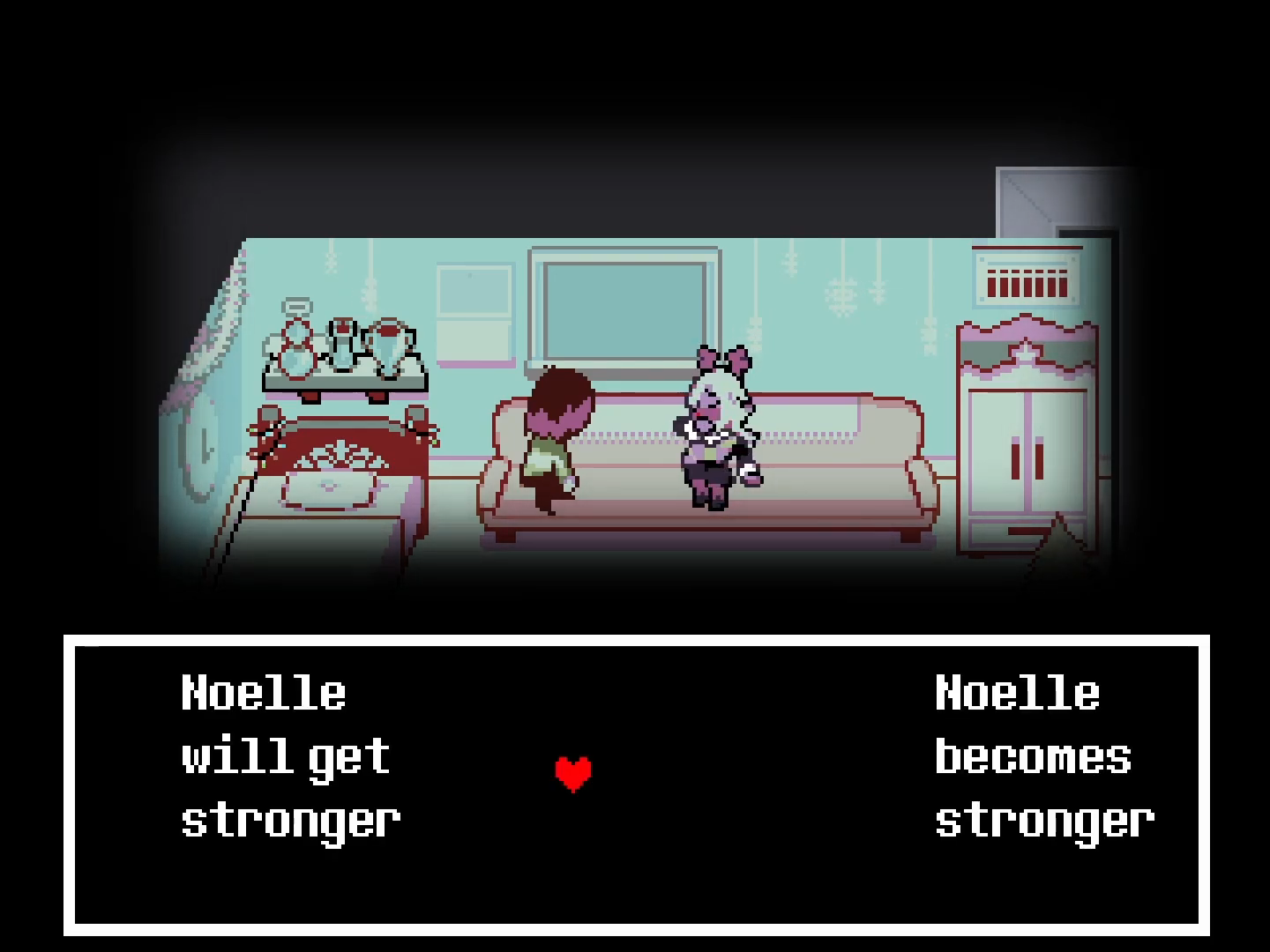 Since Kris cleverly finds loopholes in getting around doing what the player expects of them for the sake of keeping certain information to themself, it seems fair to assume that they know that the soul is being controlled by someone with very specific motives in mind or that the soul at the very least has a mind of its own that acts against their own will whenever it wants to. Either way, Kris’ apparent awareness of the soul’s sentience and the fact that they are capable of removing the soul from their body whenever they want serve to demonstrate the limits of power that the soul has over them and no other scene in Deltarune so far captures these limits better than the sequence of events that play out at Noelle’s house in Chapter 4.
