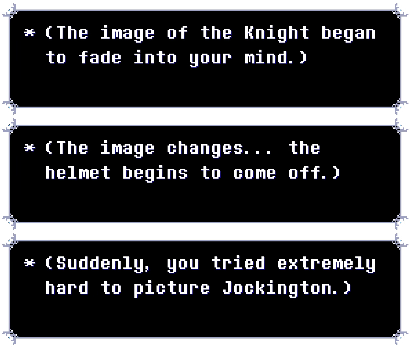 However, they have, as recently as Chapter 4, started to make sure that the player doesn’t intrude on deeper secrets that may jeopardize their friendship with Susie and their good standing as a hero of the prophecy, preventing the player from knowing the Roaring Knight’s true identity when prompted to think about them by thinking about their classmate Jockington at the last minute instead.