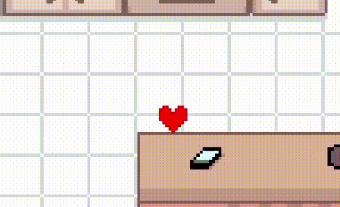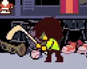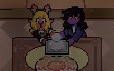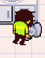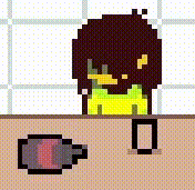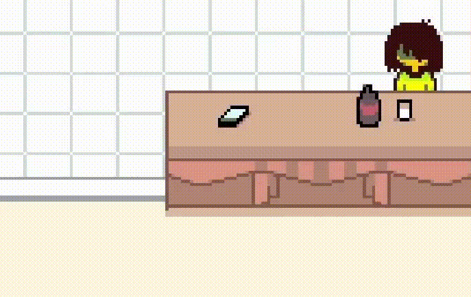 Moving around so that Kris notices the soul during this exchange would cause them to pin it to the ground and take it back to the storage room (pictured left), but if the player sits and waits instead, Kris will get visibly tired and eventually pass out on the kitchen counter (pictured right).