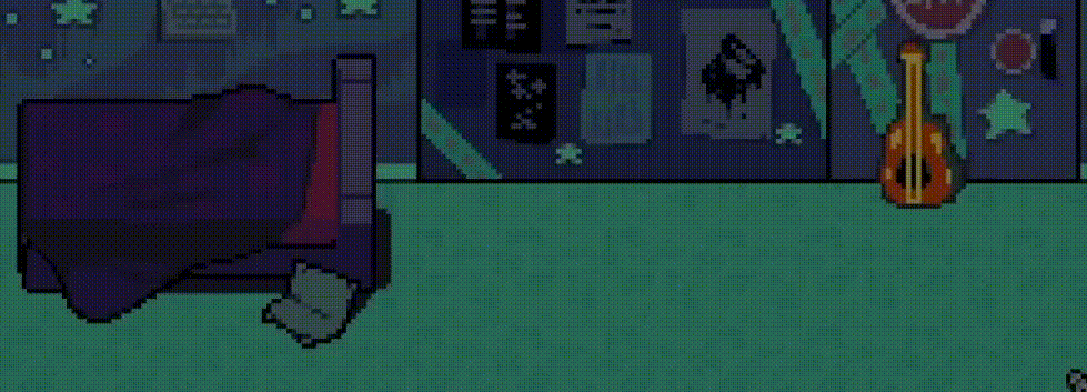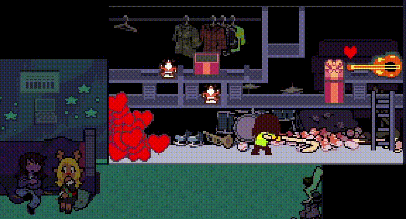 The continual push and pull of power that the player has over the situation persists after Susie and Noelle leave the room, allowing the soul to sneak back into Dess’ room seemingly undetected only for Kris to attack you with a hockey puck from under the bed if you attempt to go near the guitar.