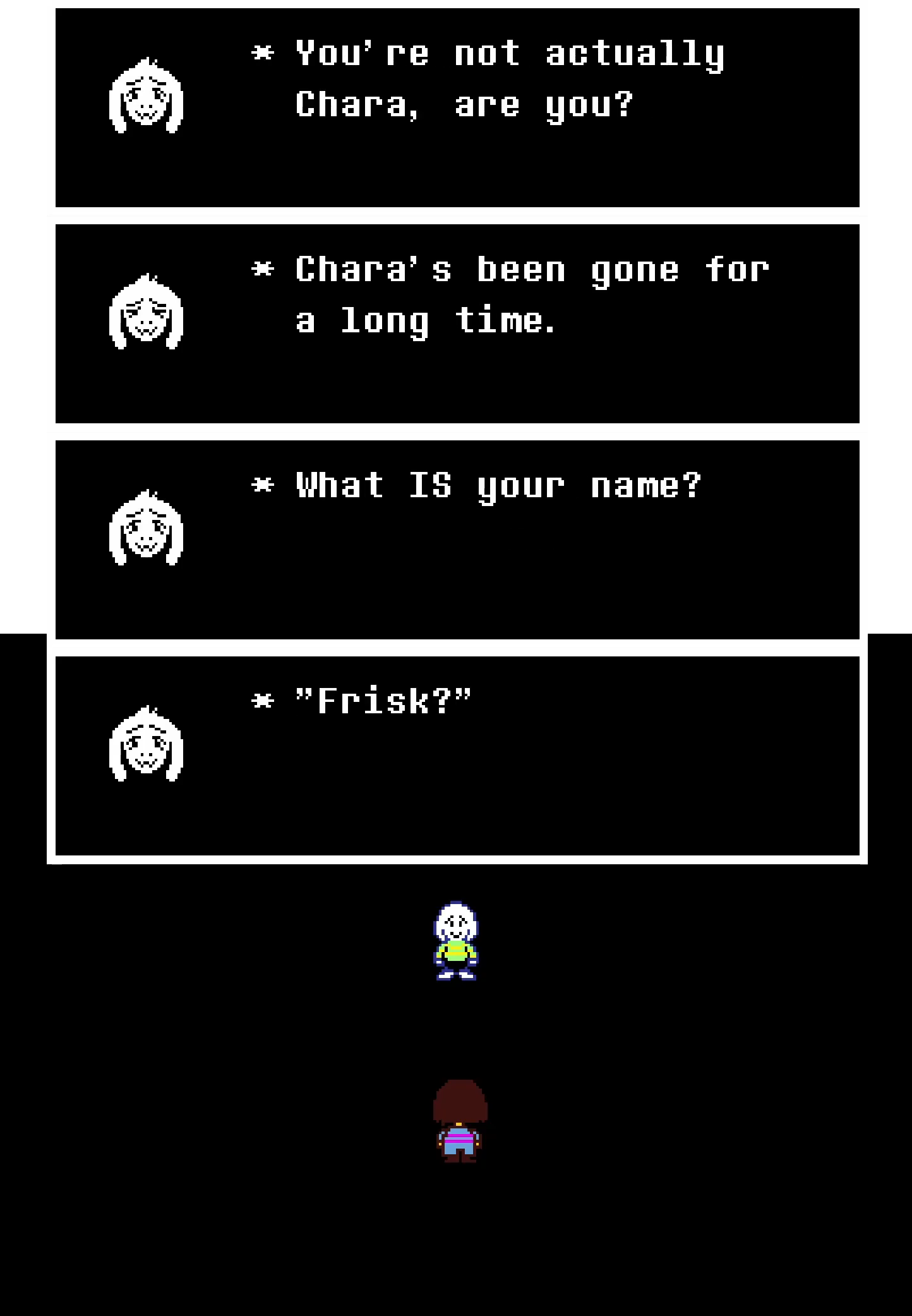 Left: the name selection screen from Undertale asks you to 'name the fallen human,' but doesn't specify which human you are naming. Right: After saving Asriel in Undertale's True Pacifist Route, the human that you named at the beginning, referred to here by their 'true' name Chara, is revealed to be the first human who fell down and lived with the Dreemurrs rather than the human that you control throughout the game, who is revealed to be named Frisk.