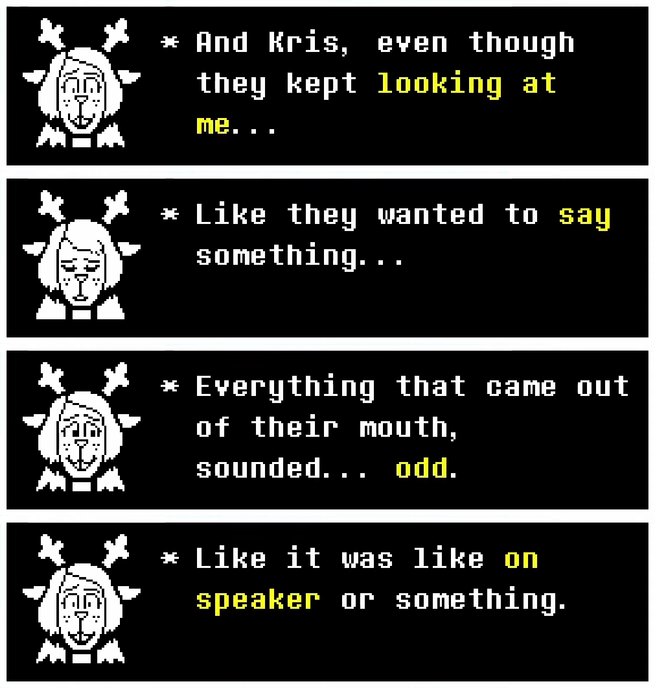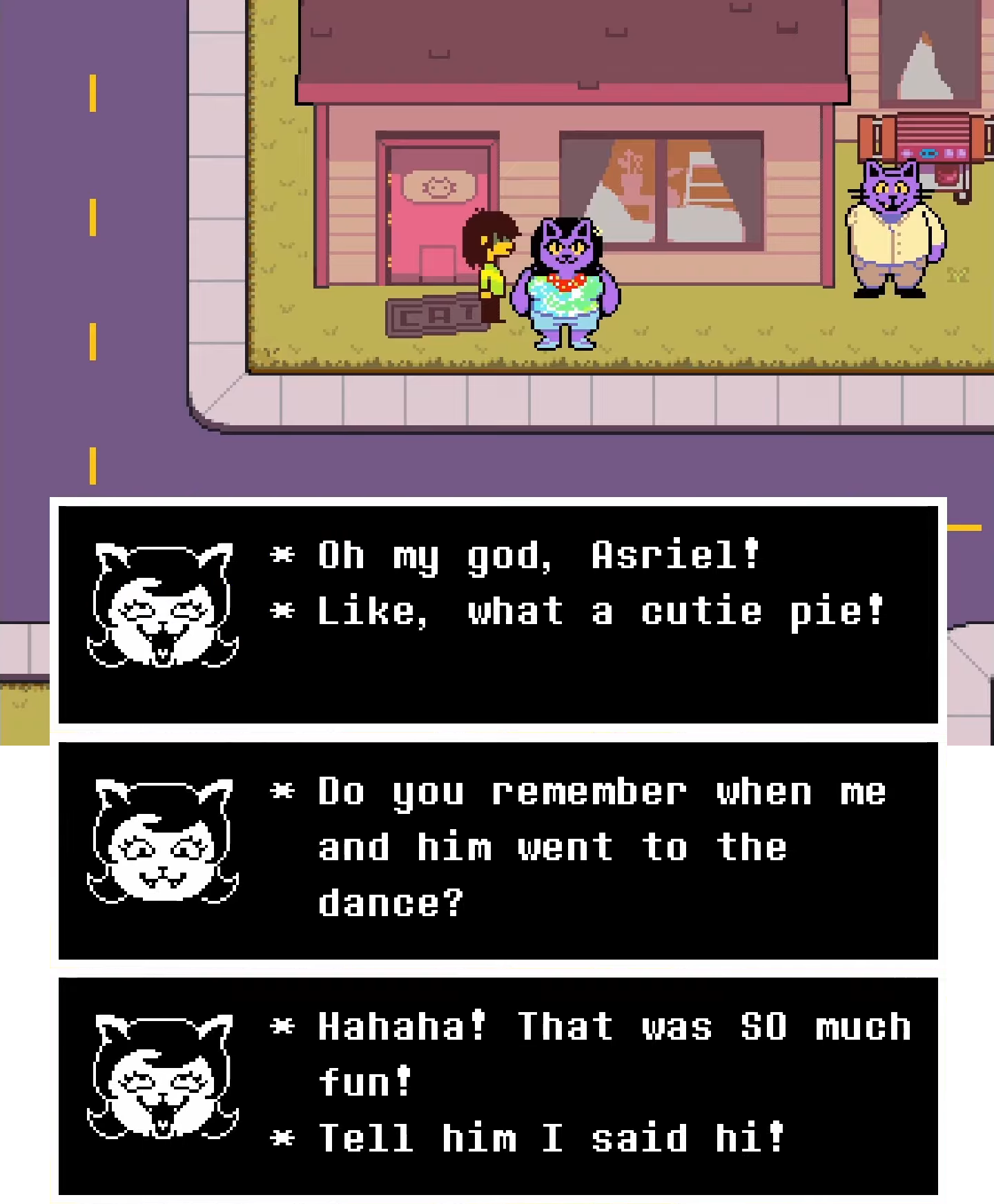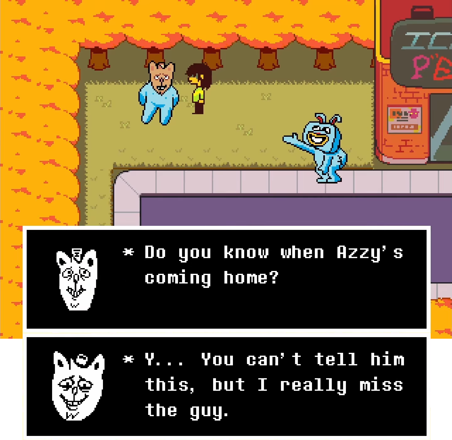 Top: Pizzapants and Catty both enthusiastically express their nostalgic memories of spending time with Asriel to Kris, indicating their brother's popularity within Hometown. Bottom: Tenna recalls how the Dreemurrs stopped having the Holiday family over for the holidays to have fun watching him, eventually becoming distant from and amongst each other. Interestingly, the older deer furthest to the right sitting close to the TV, assumed to be Dess, is the first to disappear followed by Carol, Asgore, Noelle and Rudy.