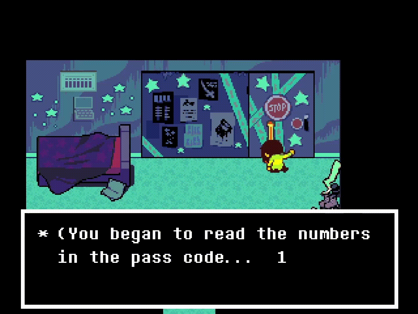 While being sent by Susie to look for clues on how to open the underground shelter that the Knight resides in, the player eventually sends Kris into the room formerly belonging to Noelle’s missing older sister Dess where a slip of paper containing a code to the shelter can be found inside her old guitar. Upon having Kris take a closer look at the code, they quickly remove the soul from their body and throw it in a storage closet, leaving the player to maneuver the soul without Kris for an extended period of time and setting the stage to establish what little power it has over the Light World on its own.