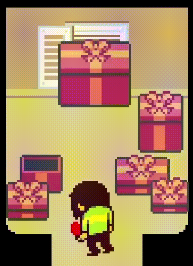 Left: Kris removes the red soul just before the last digit of the code can be revealed to the player, though those who have been paying attention may be able to decipher it for themselves... Right: Kris throws the soul into a decorative gift box, making a strong case for floating hearts as perfect gifts this holiday season.
